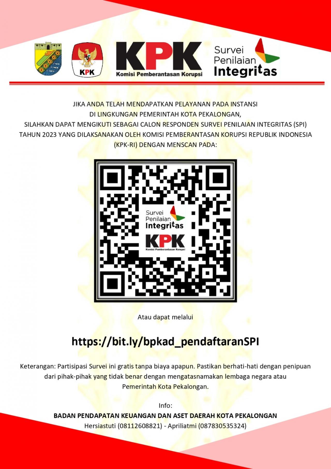 Menindaklanjuti Surat Komisi Pemberantasan Korupsi Republik Indonesia (KPK-RI) Nomor B/1350/LIT.05/10-15/03/2023 tanggal 8 Maret 2023 perihal Hasil SPI 2022 dan Pelaksanaan SPI 2023, maka akan dilaksanakan kegiatan Survei Penilaian Integritas Elektronik (E-SPI) Tahun 2023 oleh Komisi Pemberantasan Korupsi Republik di Pemerintah Kota Pekalongan, dimohon partisipasi pengguna layanan BPKAD